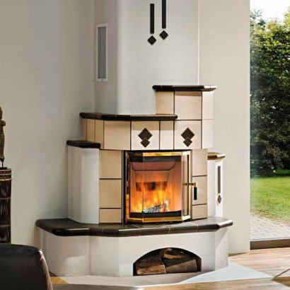 Пристенная облицовка из изразцов кремового цвета, каминные полки и столешница темного цвета. Без декора.