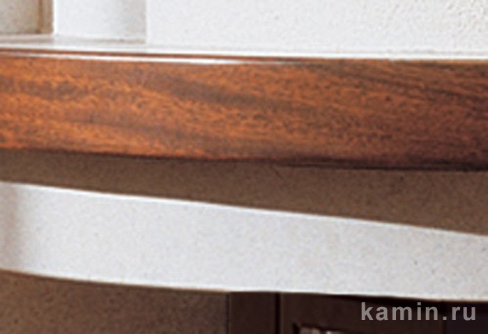 Угловая облицовка отличается закругленностью линий, цокольная и боковые части - из колотого желтого мрамора реале. Плита и топочное обрамление из полуполированного золотистого мрамора, деревянная балка. Металлический дровник черного цвета.