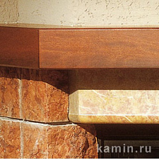 Выполнена из мрамора Rosso Asiago с неровной поверхностью, столешница из полированного мрамора Bianco Mediterraneo. Балка из соснового массива под орех.
