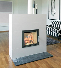Керамические стекла, расположенные друг напротив друга, позволяют организовать обзор огня в камине с двух противоположных сторон. Хорошие пропорции при небольших внешних размерах топки позволяют установить ее в самых незначительных по площади помещениях.
